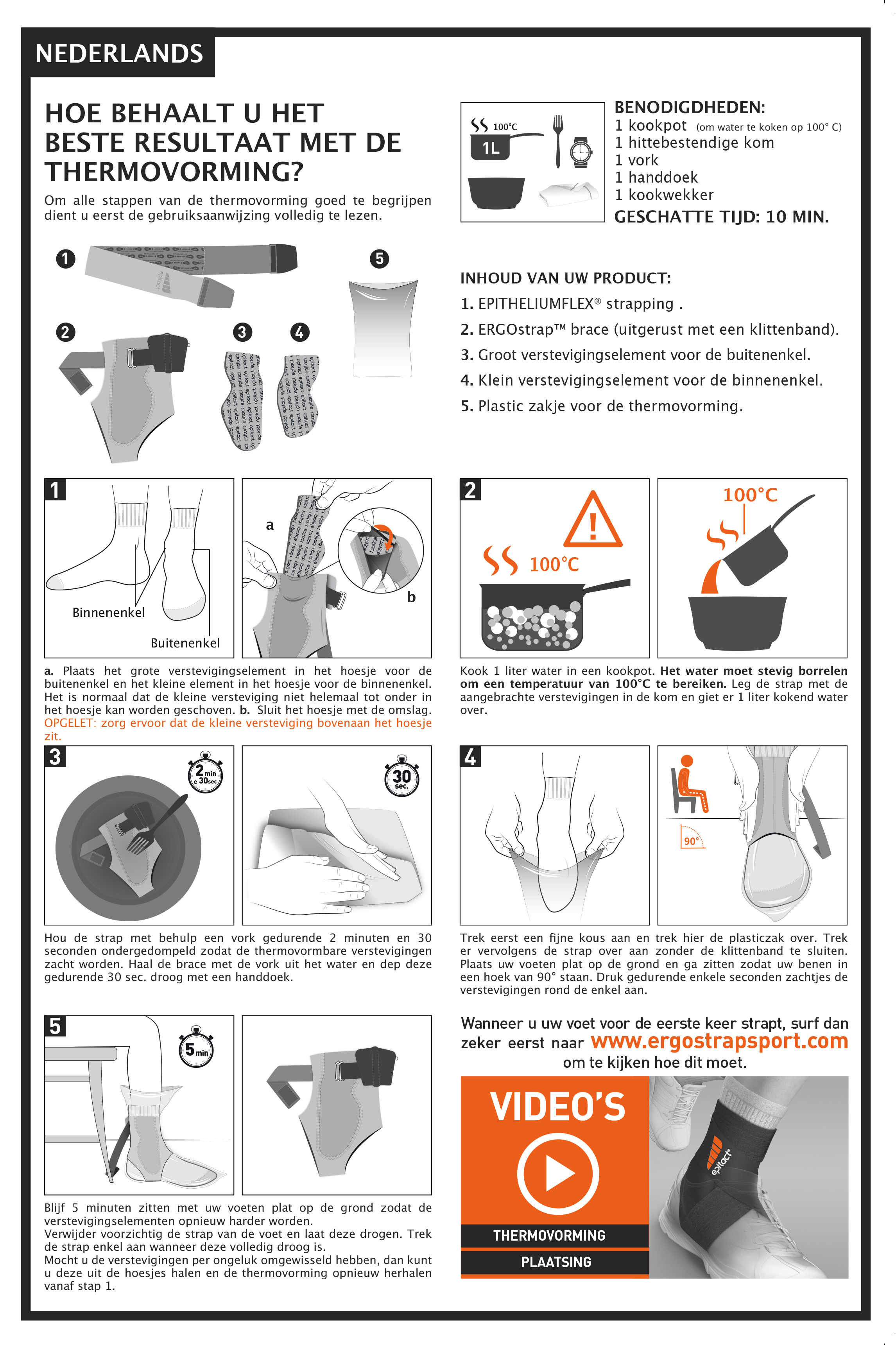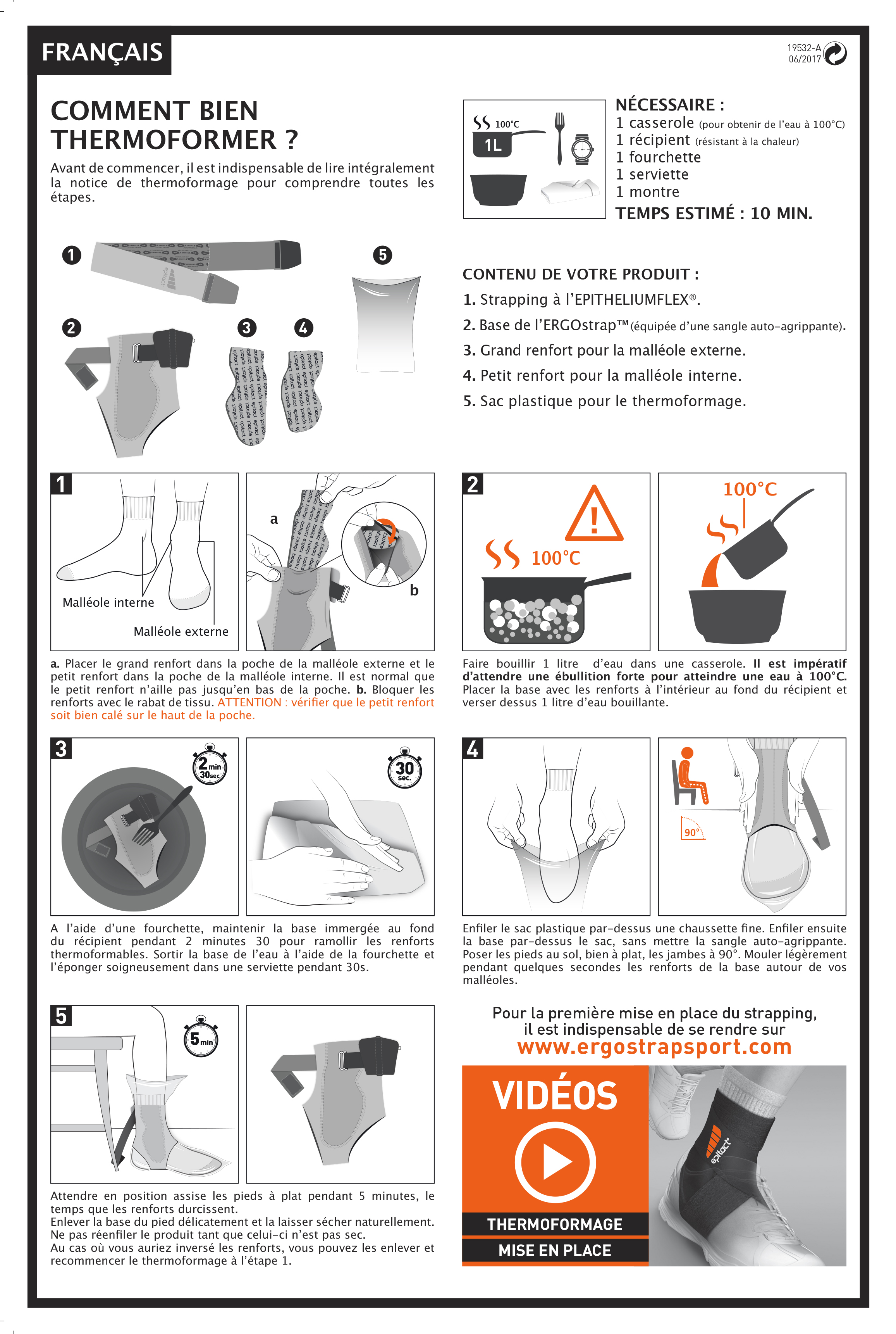 • Thermoformage : veuillez suivre la notice de thermoformage jointe ou consultez la vidéo de thermoformage disponible sur www.ergostrapsport.com. L’ERGOstrapTM Sport peut être thermo- formé plusieurs fois si nécessaire.